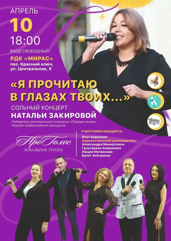Приглашаем вас на незабываемый концерт, который состоится уже совсем скоро! Вас ждёт вечер, наполненный живой музыкой, яркими эмоциями и уникальной атмосферой. На сцене выступят талантливые артисты, чьи голоса и мастерство покорили сердца тысяч слушателей. В программе — как любимые хиты, так и новые композиции, которые никого не оставят равнодушным. Не упустите шанс стать частью этого музыкального праздника, зарядиться позитивной энергией и провести время в компании единомышленников. Билеты уже в продаже — спешите занять лучшие места!